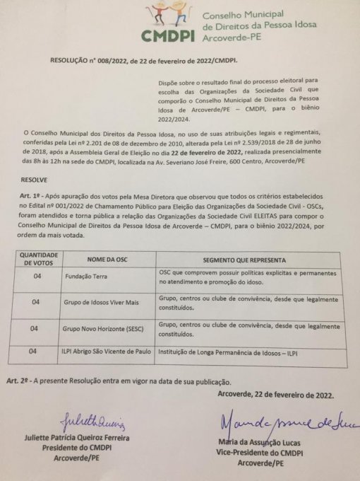 - Edital n. 001/2022 - Chamamento Público para Eleição das Organizações da Sociedade Civil - OSCs, para o Conselho Municipal dos Direitos da Pessoa Idosa de Arcoverde - Biênio 2022/2024